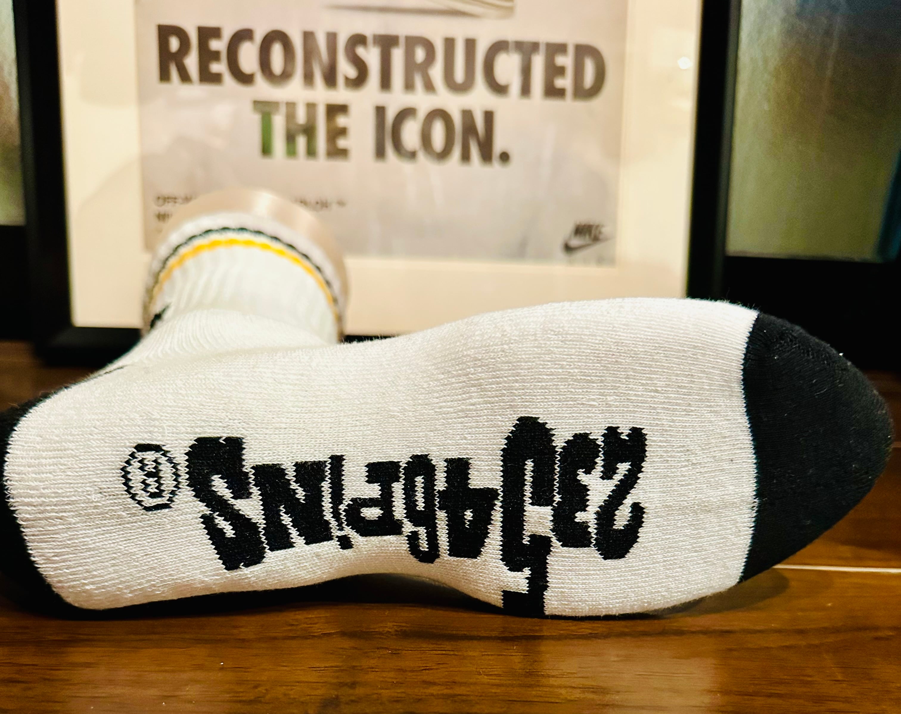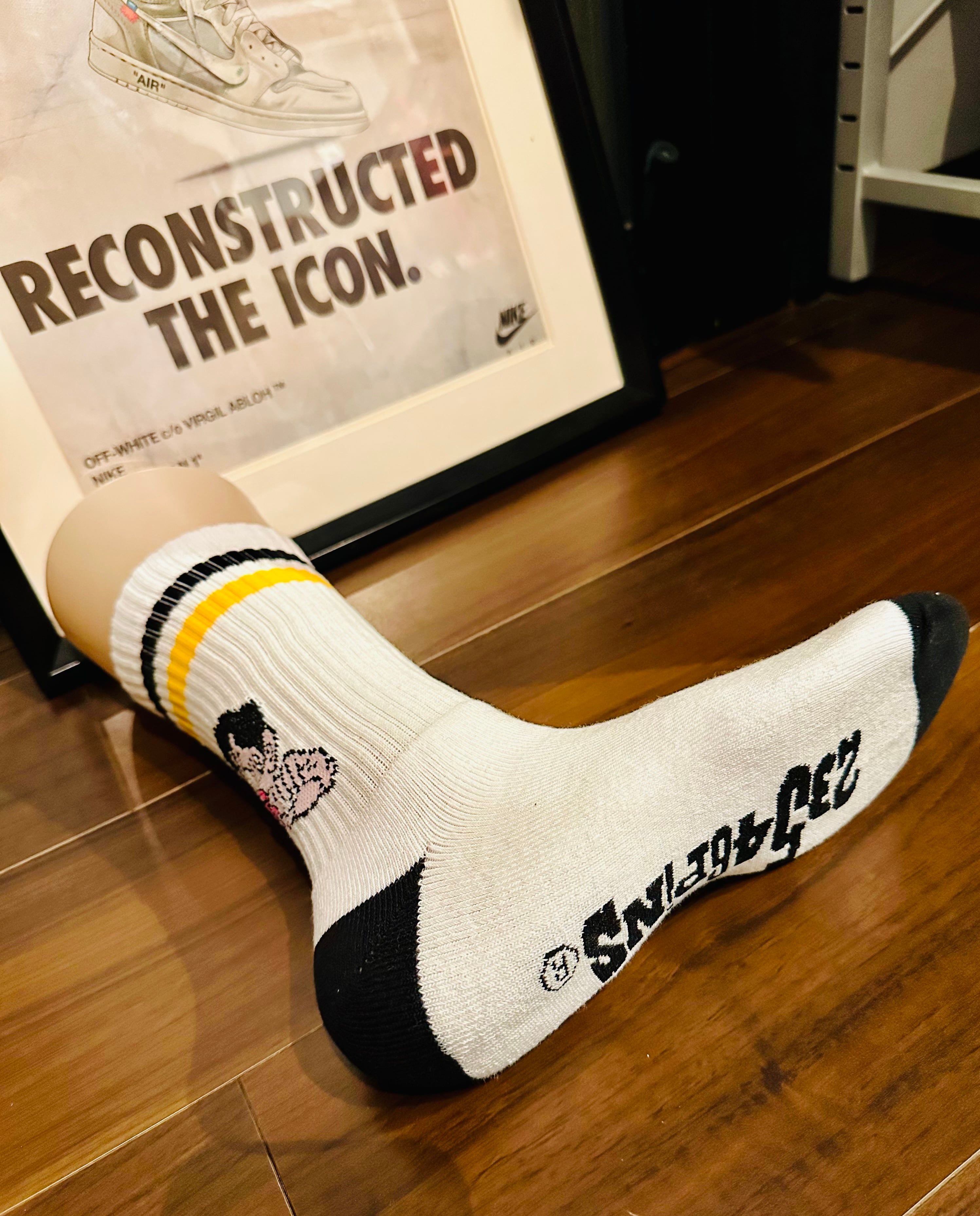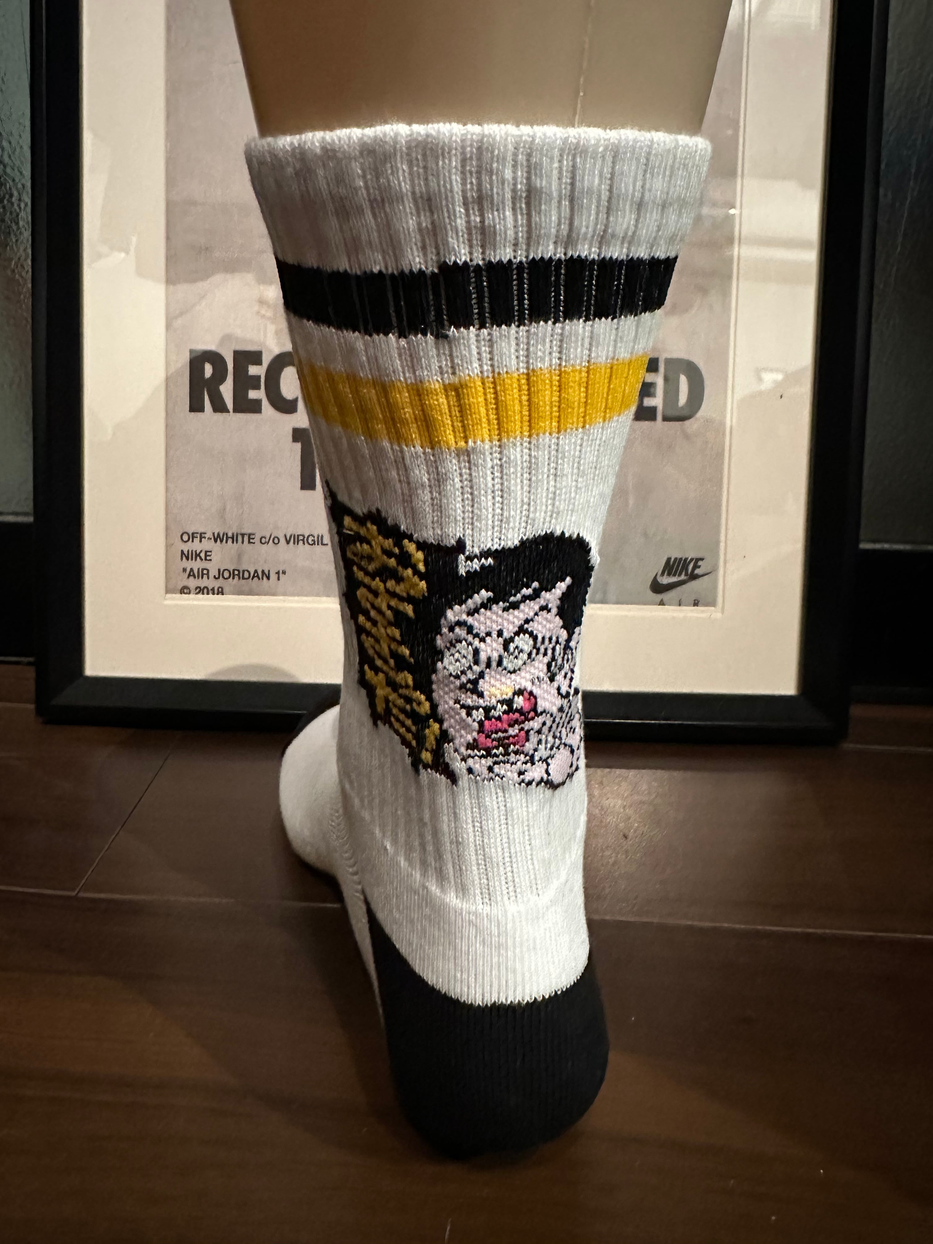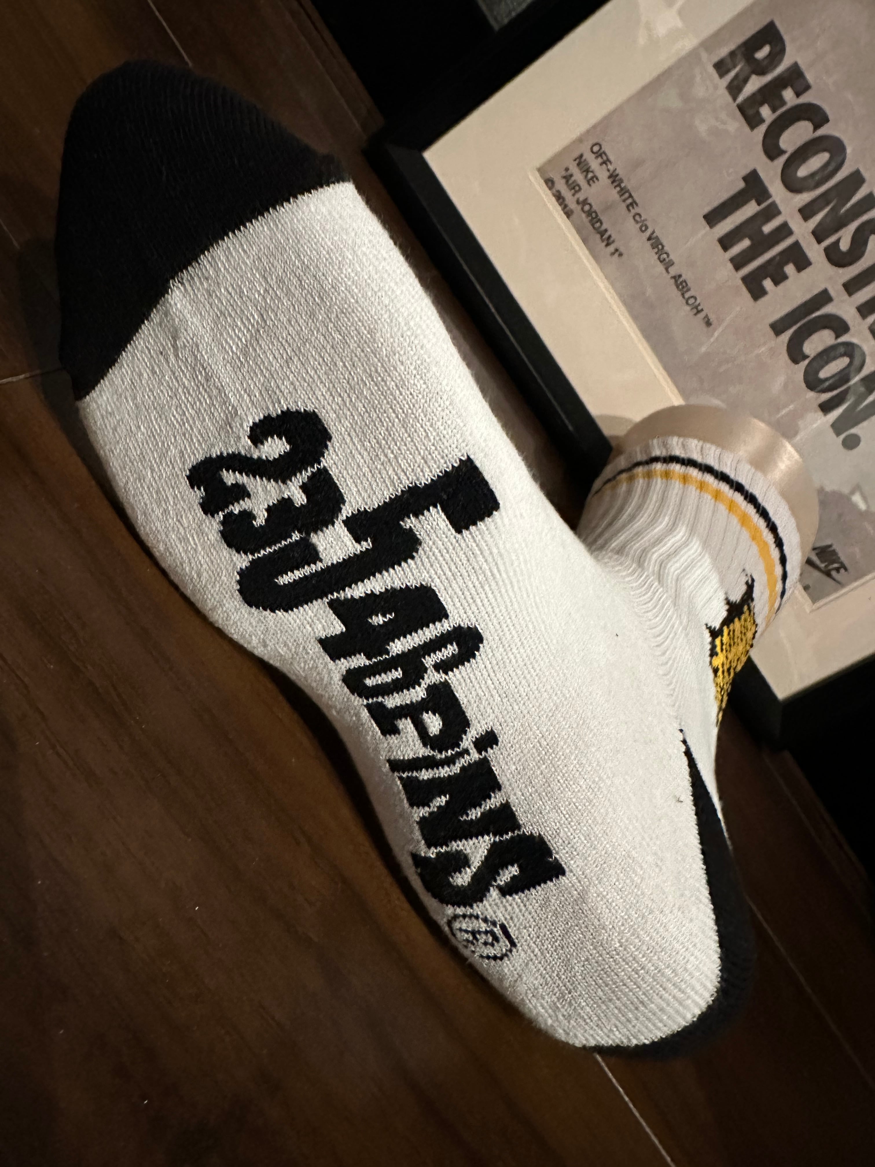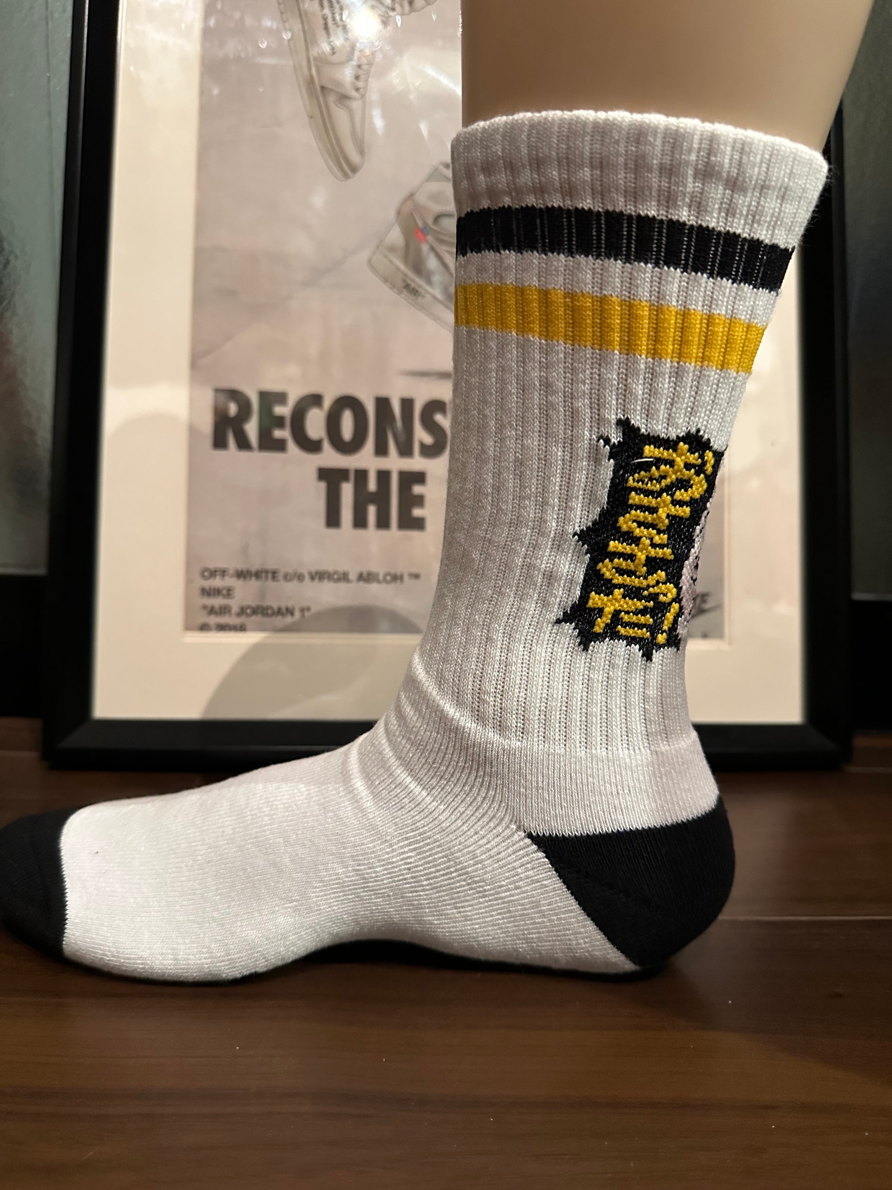 『北海道弁 おささった! 靴下 ソックス 白』の登場です! 黒と黄色のライン靴下に北海道の方言「おささった!」をデザインに取り入れたこの靴下は、遊び心溢れるユニークなアイテムです♪